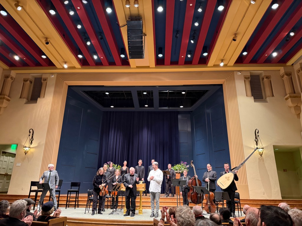 Philharmonia Baroque Orchestra and Chorale presented a program entitled Jewish Nightlife: Hebrew Poetry, Kabbalah, and Coffee (ovation pictured) last night at Congregation Emanu-El. This evening of chamber music, led by Maestro Nicholas McGegan, was jaunty and charming.