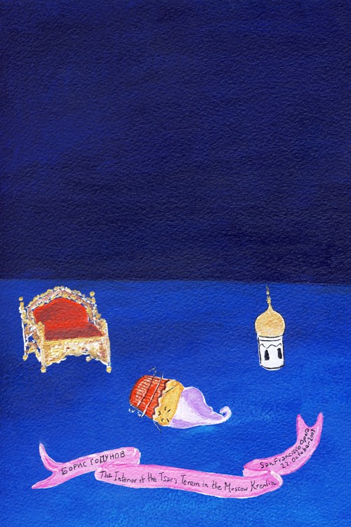 This is the fifth scene from Boris Godunov. Boris, portrayed by Samuel Ramey, has just thrown himself to the ground in an agressive manner.