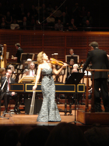 Anne-Sophie Mutter gave the US premiere of Sofia Gubaidulina's second violin concerto, In tempus präsens, with San Francisco Symphony, conducted by Michael Tilson Thomas, yesterday. The piece was played again tonight, and has a shimmering, yet compressive quality, filled with bumblebees and crickets. Mutter played cleanly and with much vigor. The violas, cellos, and basses sounded lovely, as did the percussion section, particularly the gong. It was a bit difficult to hear the harpsichord, even though it was amplified. The trombones and tuba sounded strangely sputtering, though this is probably not due to their skills as players.