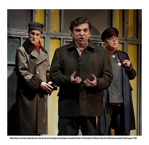John Rea‘s reorchestration of Wozzeck had a West Coast premiere last night in San Francisco. Ensemble Parallèle was both robust and focused under conductor Nicole Paiement. The 28 musicians produced a much sound, despite their small numbers, even overwhelming the singing on occasion. Brian Staufenbiel‘s production made artful use of video that eschewed, for the most part, the effect of an oversized screen saver. There were two instances of live video capture, one of the Hauptmann when he was being shaved and one of the Doktor when he was experimenting on Wozzeck. The latter came off as somewhat artificial, since there is no reason in the plot the Doktor is obliged to stand so still and face away from the person he is speaking to. The set was versatile and clean, essentially consisting only of two pieces that were rolled this way and that to suggest the many scenes.