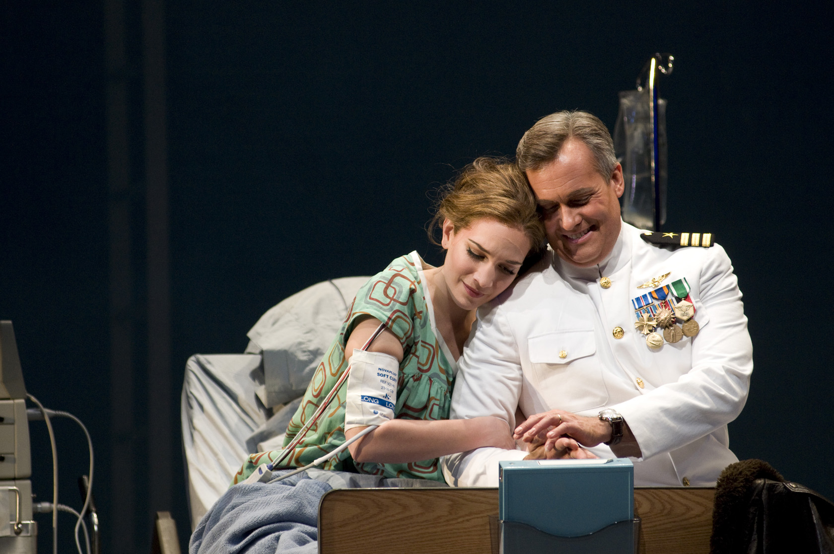 The singing was all quite lovely. Museop Kim, David Won, and Karen Vuong were convincing in their duel roles as North Vietnamese villagers and American hospital staff. The voices of Nicholas Coppolo (Icarus/Young Boy) and Jordan Bisch (Daedalus/Young Boy’s Father) were evocative and blended nicely together. As the young Amelia, Ashley Emerson was eerily child-like. Her voice was very pretty, flexible, and youthful.