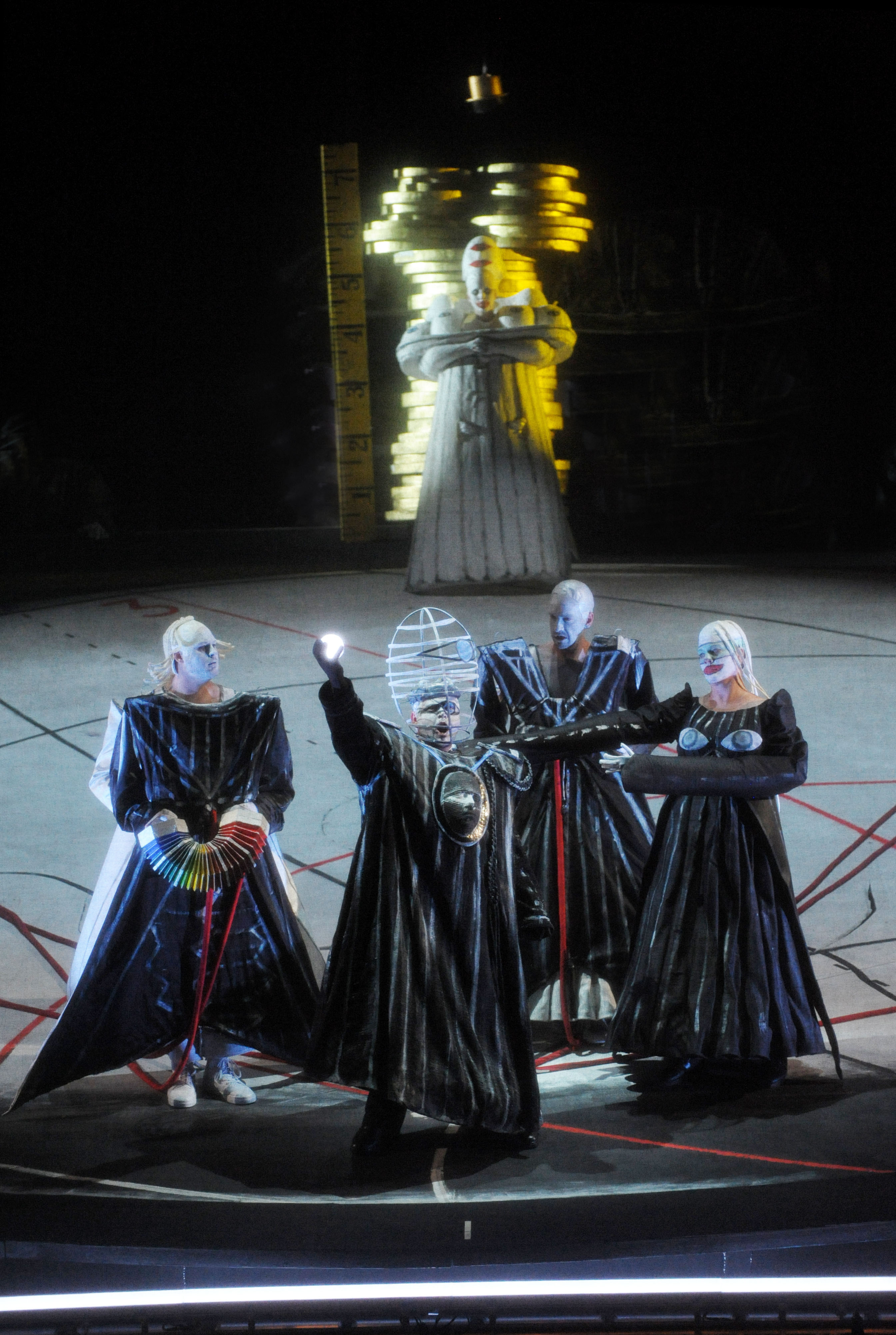 Achim Freyer's production has an entertaining circus element to it, as far as costumes and effects. It also is a strange cross of Star Wars, The Nightmare Before Christmas, and Neil Gaiman's Sandman graphic novels. There really were light sabers in the production, for instance. The steep rake was a challenge, Richard Paul Fink fell after Scene 1, and the other singers had similar problems. All of the scenes were quite arresting, much was going on, but for the most part it all made some sort of internal sense. However, the very last part, when the Gods are to go to Valhalla, a nondescript object suspended from wires swept across the stage. The audience in Balcony B clearly could not discern what this was meant to represent and many people started talking at this point.