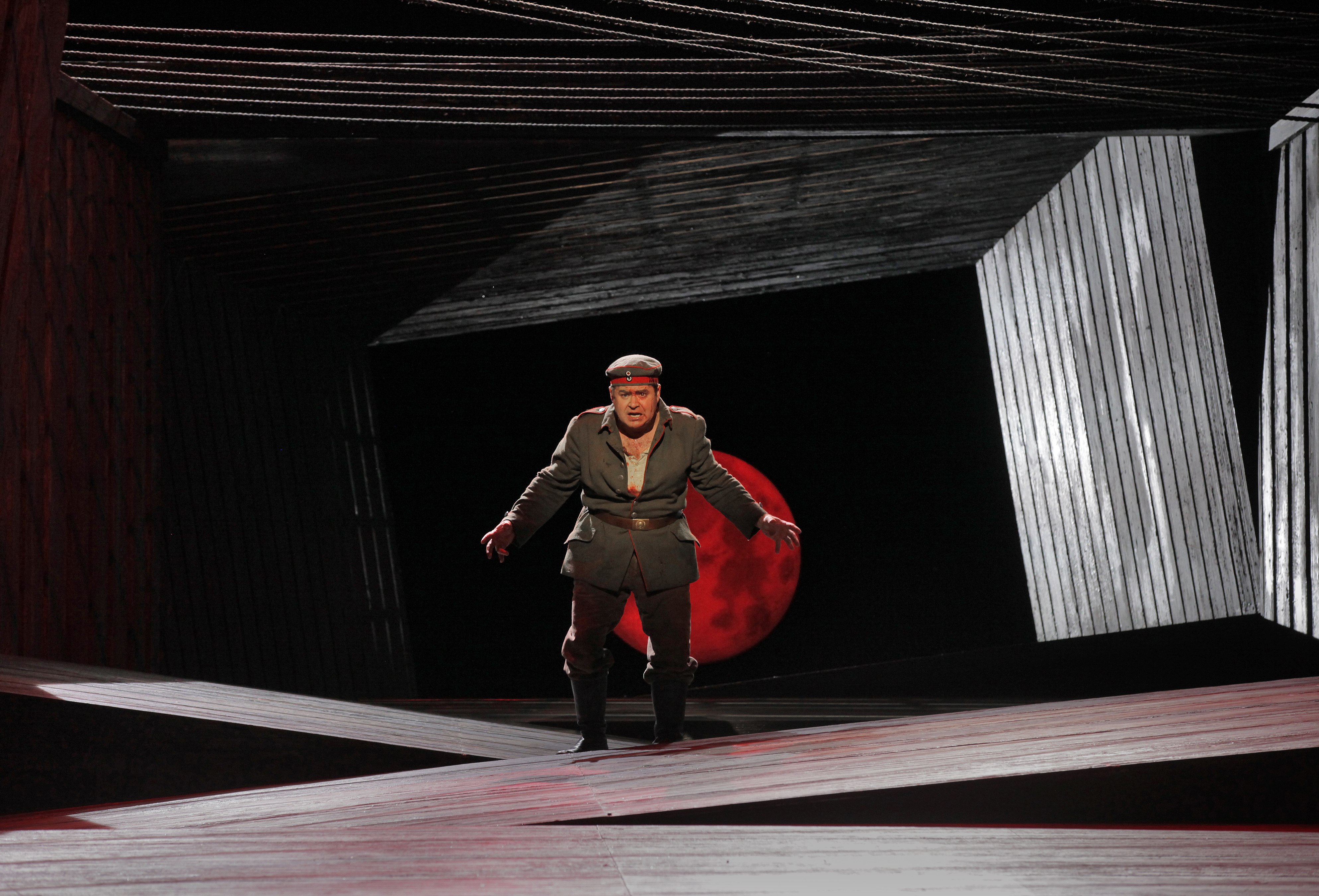 The singers were strong. The chorus was together and sounded almost strangely beautiful. Stuart Skelton was menacing as the Drum Major, yet his voice was appealingly warm and bright. Eric Owens was quite funny as the Doctor, with a rich, powerful sound. Robert Brubaker also made for a humorous Captain, his voice is pingy and cuts through the orchestration without being shrill. Nicola Beller Carbone (Marie) showed a range of emotions through her voice, her singing in Act III, Scene 1 was particularly lovely. Her physicality throughout the opera was admirable. Richard Paul Fink (pictured above in Act III, Scene 4, photograph by Ken Howard) gave a visceral and captivating performance as Wozzeck. Fink excels at Sprechstimme, and he inhabited the character completely.