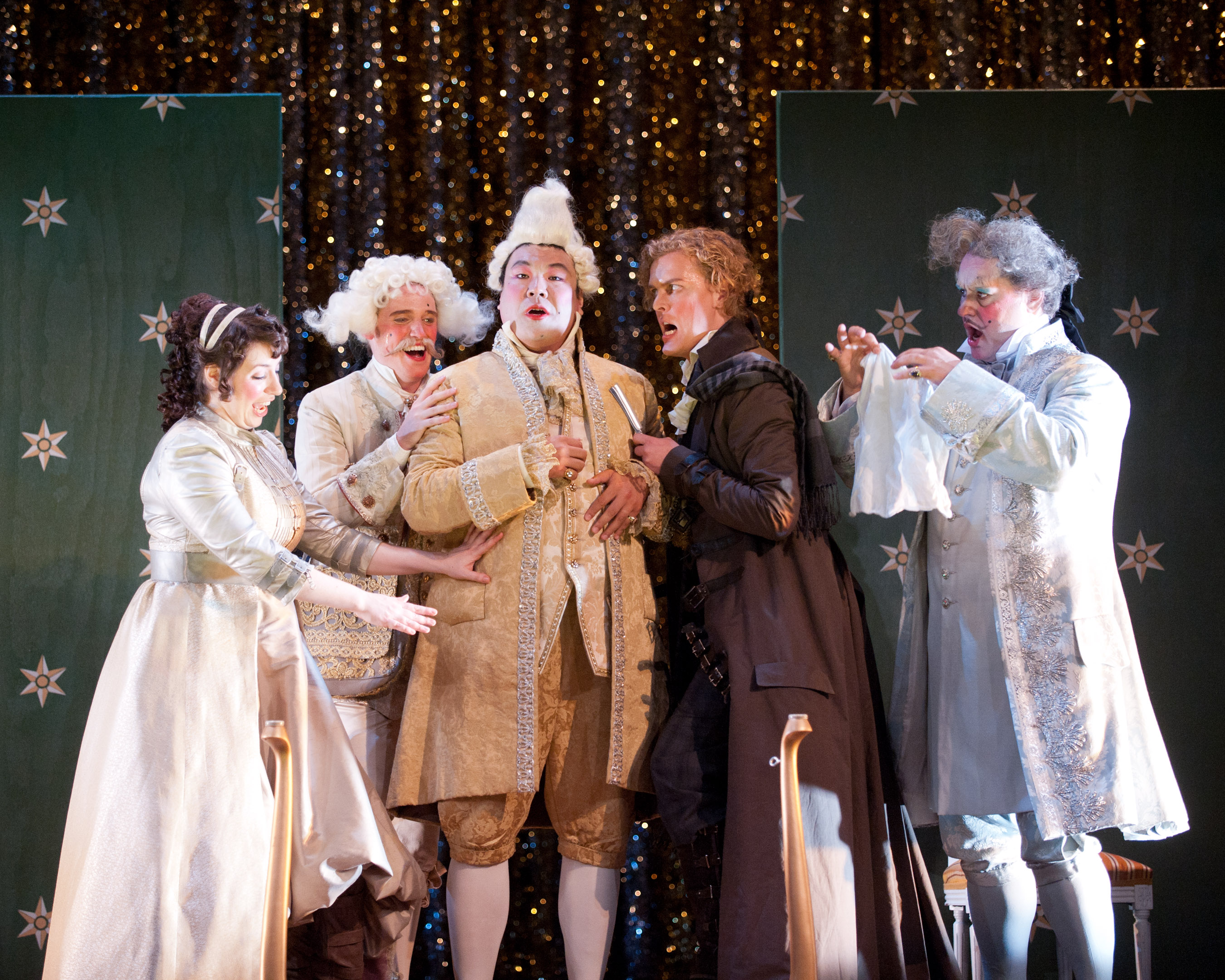 The Merola Opera Program‘s Il barbiere di Siviglia (Act II, Scene 5 with Renée Rapier, Daniel Curran, Peixin Chen, Mark Diamond, and John Maynard pictured left; photograph by Kristen Loken) returned with a second cast on Friday night. The orchestra, conducted by Mark Morash, sounded more comfortable this time around. Again, this group of singers was vocally strong. As a whole, the movements were understated and the acting was not overblown. Marina Boudart Harris (Berta) sang “Il vecchiotto cerca moglie” mournfully. Peixin Chen impressed as Don Basilio, his voice is full and almost bottomless. His “La Calunnia” was robust. John Maynard’s Dr. Bartolo was amusingly imprudent and conniving. Maynard sang smoothly and with ease.