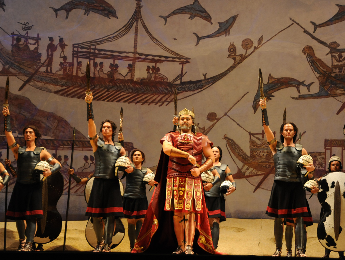 Last weekend the 28th season of Opera San José opened with Idomeneo. The production (Act I pictured left, photo by P. Kirk) directed by Brad Dalton, is gorgeous. Steven C. Kemp's set looks meticulously researched, and Johann Stegmeir's costumes were quite pretty. The choreography, from Dennis Nahat, did not always go with the text, but worked well on the singers. The dancing was rather festive, but not executed perfectly.