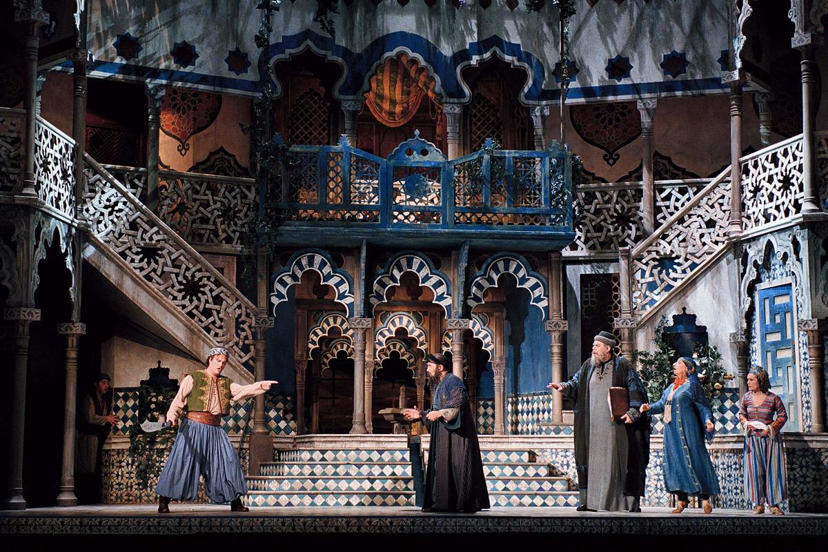 The Moorish set from Jean-Marc Stehlé and Antoine Fontaine, with matching costumes from Elsa Pavanel, is elaborate. The direction tended toward camp and silliness. This seemed to delight the majority of the audience, though someone did boo forcefully when Serreau appeared for her ovation.