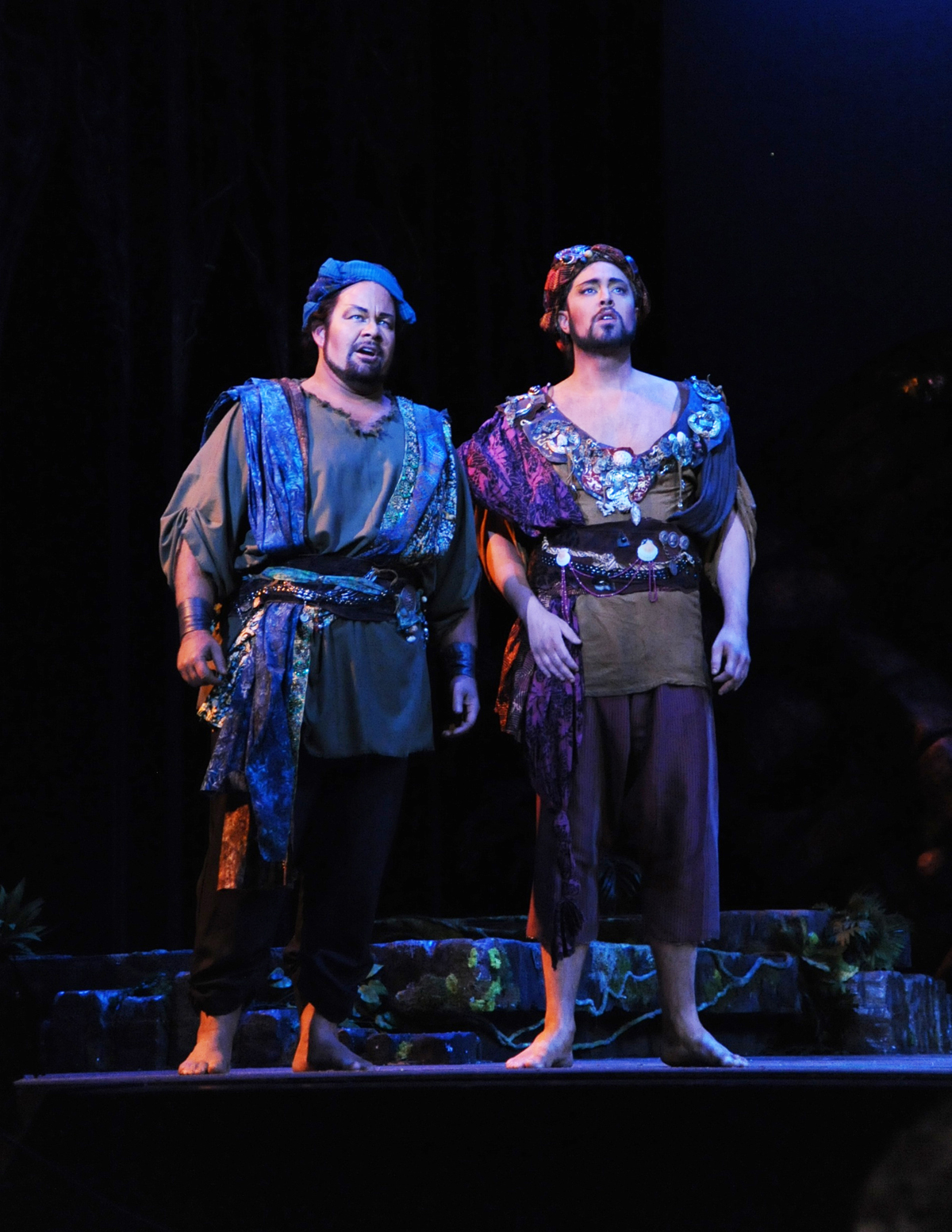 The Pearl Fishers (Act I with James Callon and Zachary Altman, photograph by P. Kirk) opened the 2012-2013 season at Opera San José over the weekend. Sunday’s performance gave a compelling case for this opera, which is so much less popular than Bizet’s Carmen. Maestro Anthony Quartuccio had the orchestra going at a neat, steady pace. The oboe solo in Act II was especially beautiful.