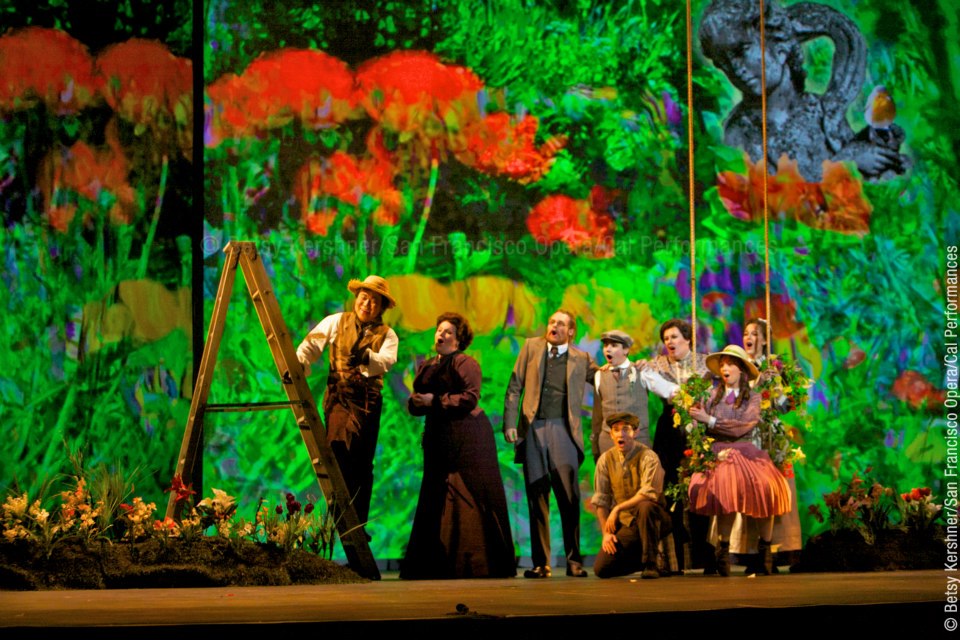 San Francisco Opera and Cal Performances presented the world premiere of Nolan Gasser's The Secret Garden (Act II pictured left, photograph by Betsy Kershner) last night in Berkeley. The music features a tiny ensemble of ten instrumentalists, lead by conductor Sara Jobin. The rhythms employed are of interest, particularly in the prologue, which is set in India. Carey Harrison's libretto has some awkward moments, somehow the narrative of the book does not always work well as sung text. This is evident in the Cholera scene and when Colin sings about how he will live to adulthood. Other parts are more successful. The letter scene between Susan Sowerby and Archibald Craven is quite beautiful. The production, directed by José Maria Condemi, moves along nicely. The costumes are of the period, and are perfectly serviceable. Naomie Kremer's hallucinatory visual designs range from cartoonish to Impressionistic.