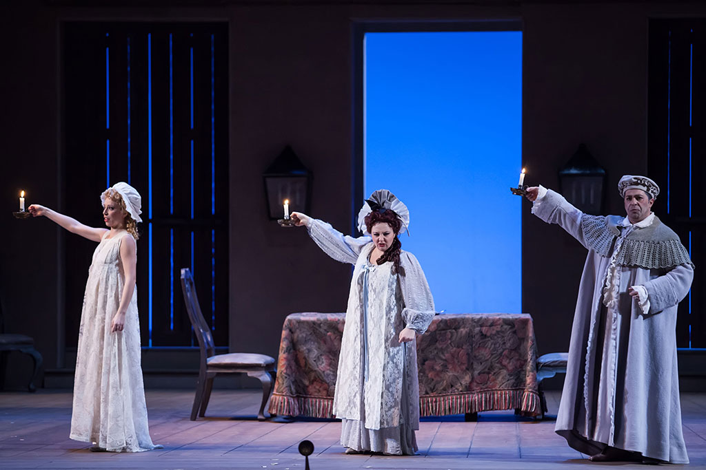 Likewise with the singing, which was often quiet compared with the sound of the orchestra. Emanuele D'Aguanno (Paulino) seemed particularly strained. Barbara Bargnesi (Carolina) was cute, but her acting was on the dull side. Only Chiara Amarù, as aged aunt Fidalma, shone. Her sense of comic timing sparkled, and her voice is strong.