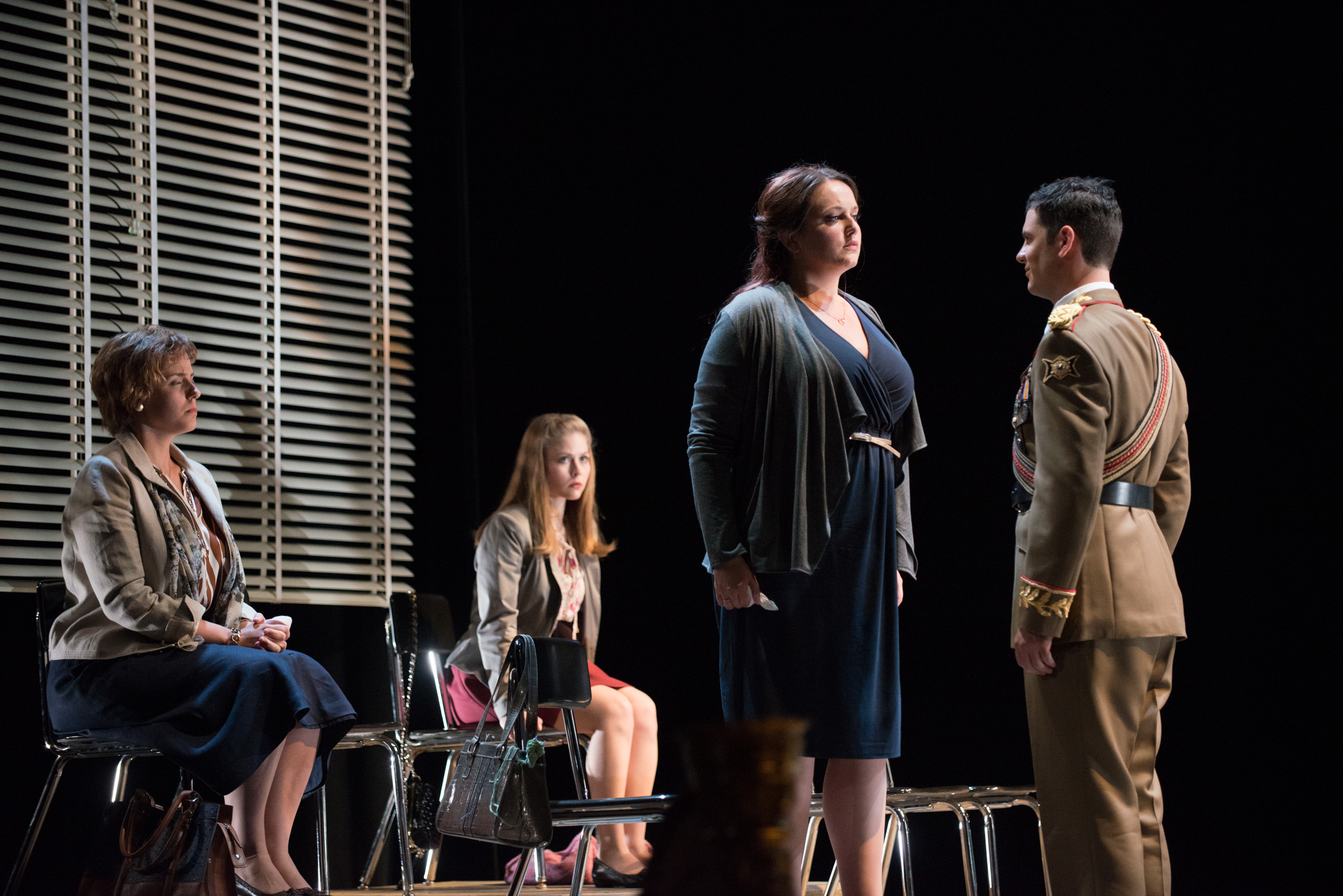 Britten’s The Rape of Lucretia was performed last night by the Merola Opera Program at Everett Middle School in San Francisco. The production (pictured left with Katie Hannigan as Bianca, Alisa Jordheim as Lucia, Kate Allen as Lucretia and Chris Carr as Tarquinius; photograph by Kristen Loken) directed by Peter Kazaras, is elegant and contemporary. Donald Eastman’s scenic design is essentially just platforms, furniture, and blinds, but comes to life beautifully with Chris Maravich’s lighting. The production complements the music, and the dramatic moments of this opera held together nicely. The proceedings seemed altogether fresh and vibrant.