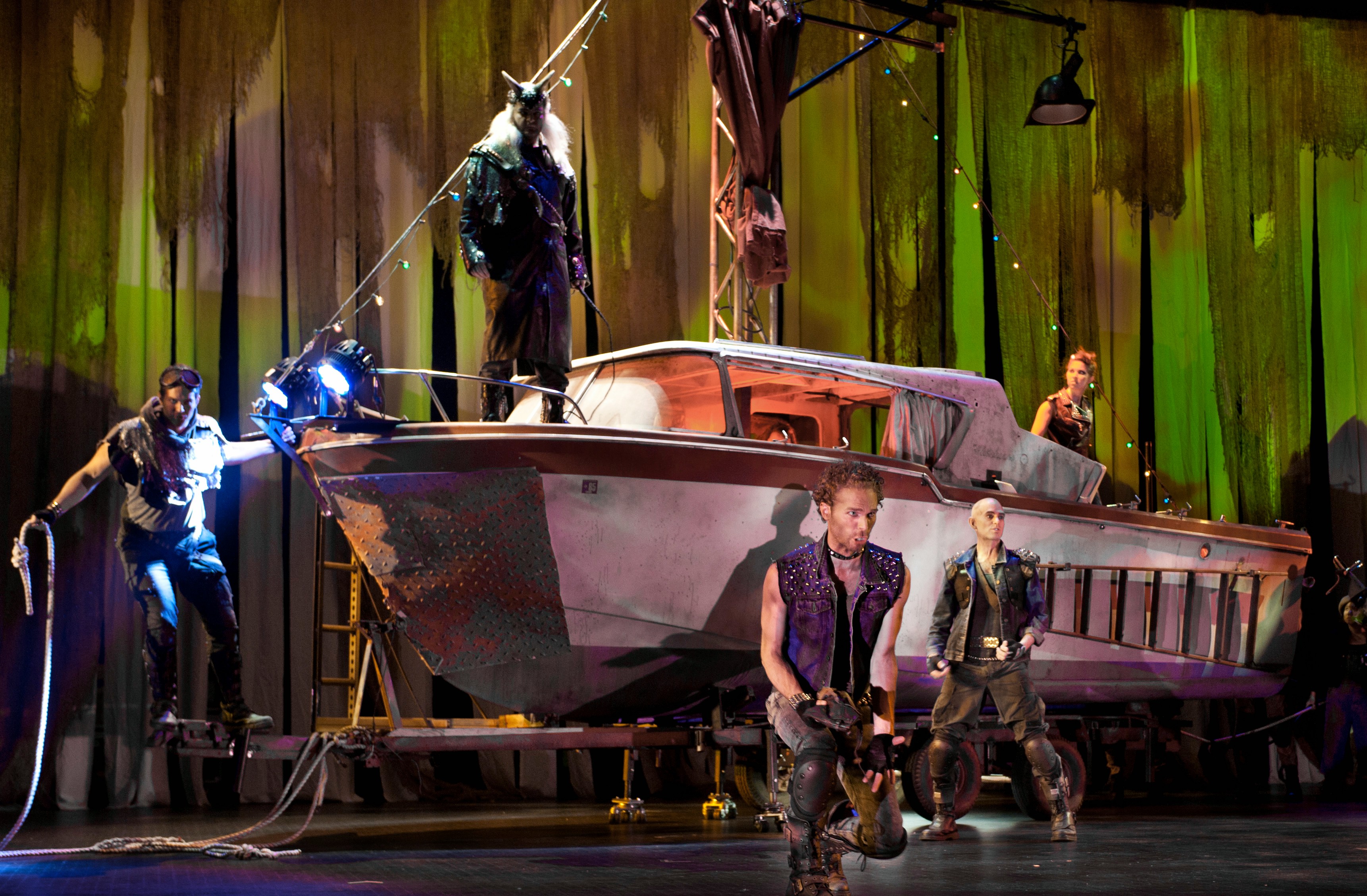 Opera Parallèle has put together a double bill of Mahagonny Songspiel with Les mamelles de Tirésias at Yerba Buena Center for the Arts in San Francisco. Opera Parallèle has embedded the Poulenc between the second and third parts of the Weill. Director Brian Staufenbiel never lacks for ideas and connects the two pieces by setting them in an apocalyptic future, which looks distinctly like Steampunks at Burning Man. The main set piece is a boat on wheels (pictured above, photograph by Steve DiBartolomeo) that is pulled around the stage by the singers. The action includes quite a lot of choreography, especially for the San Francisco Girls Chorus, the OP Chorus, and the Resound Ensemble. The effect of all these elements together is disorienting and utterly surreal.