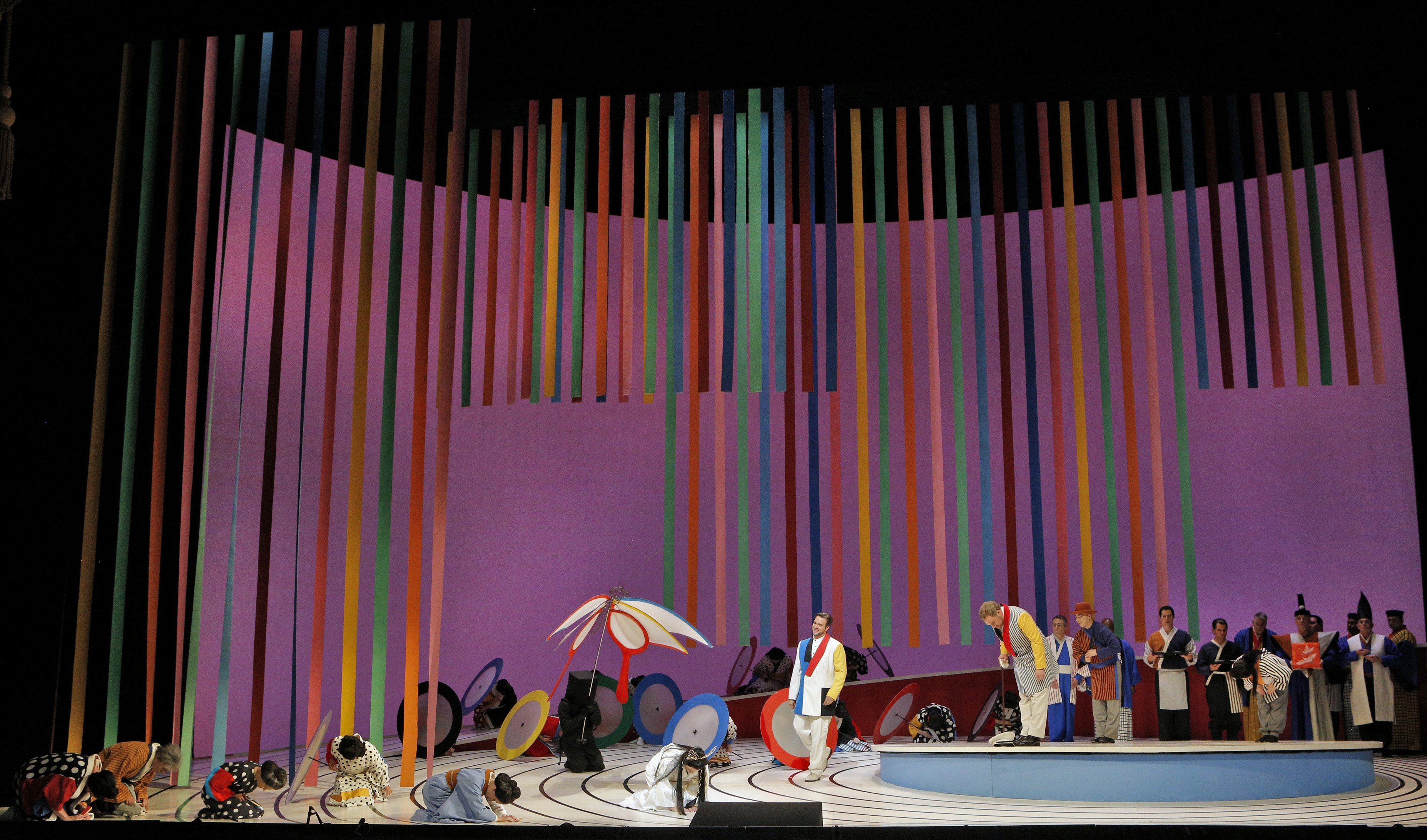 Jun Kaneko's production of Madama Butterfly (Patricia Racette as Cio-Cio-San, Brian Jagde as Pinkerton, and Brian Mulligan as Sharpless in Act I pictured left; photograph by Cory Weaver) had a fifth performance at San Francisco Opera last night. The set and costumes have an elegant guilelessness. The staging, directed by Leslie Swackhamer, is likewise straightforward and makes charming use of four kurogo (stagehands dressed in black).