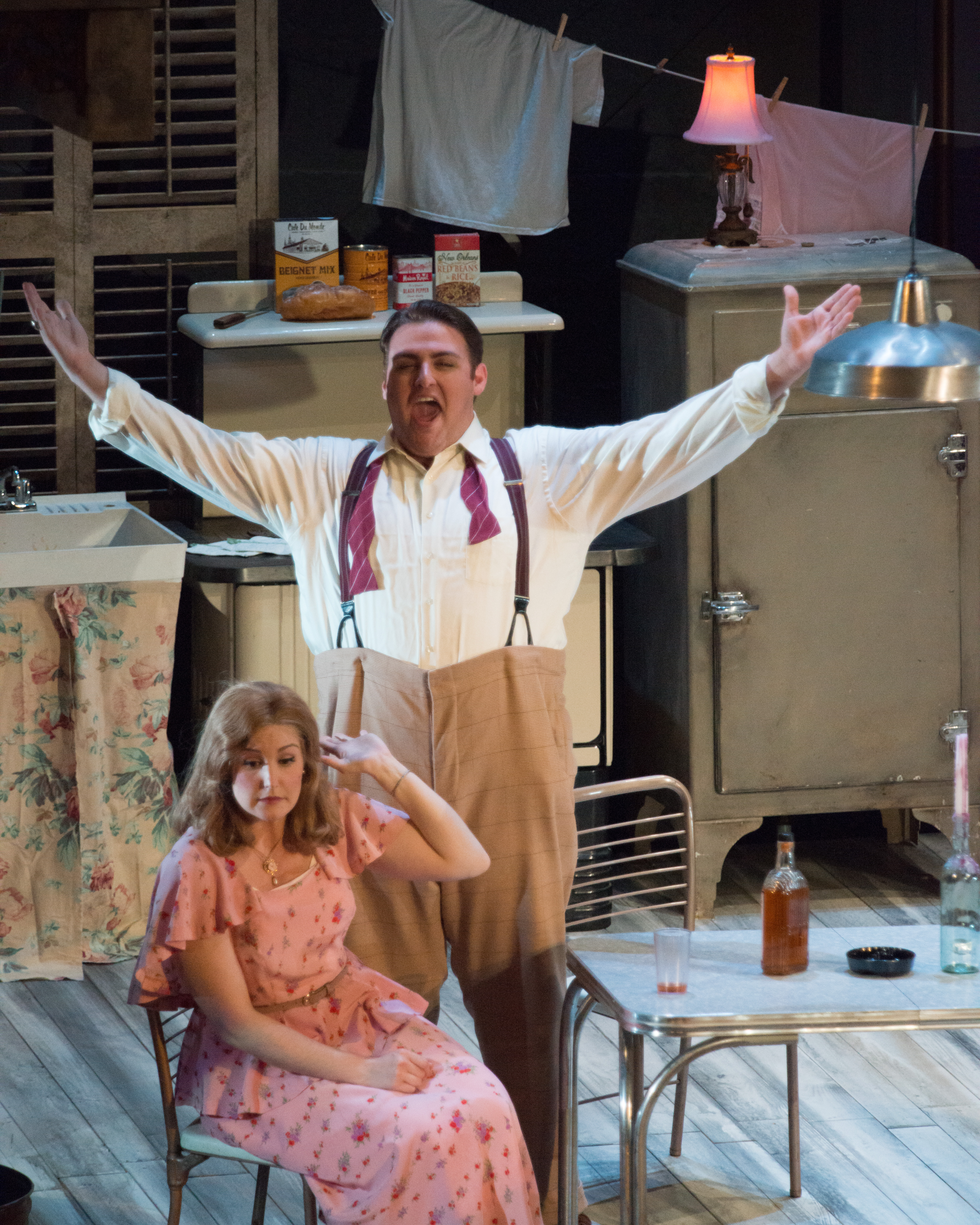 André Previn’s A Streetcar Named Desire was performed Thursday night by the Merola Opera Program at Everett Middle School in San Francisco. The production (pictured left with Julie Adams as Blanche DuBois and Casey Candebat as Harold “Mitch” Mitchell, photograph by Kristen Loken) directed by Jose Maria Condemi, is attractive. The set has two levels and is rather detailed. The costumes are straightforward and pretty. Mark Morash conducted a reduced orchestration by Peter Grunberg. The ensemble sounded rather vigorous.