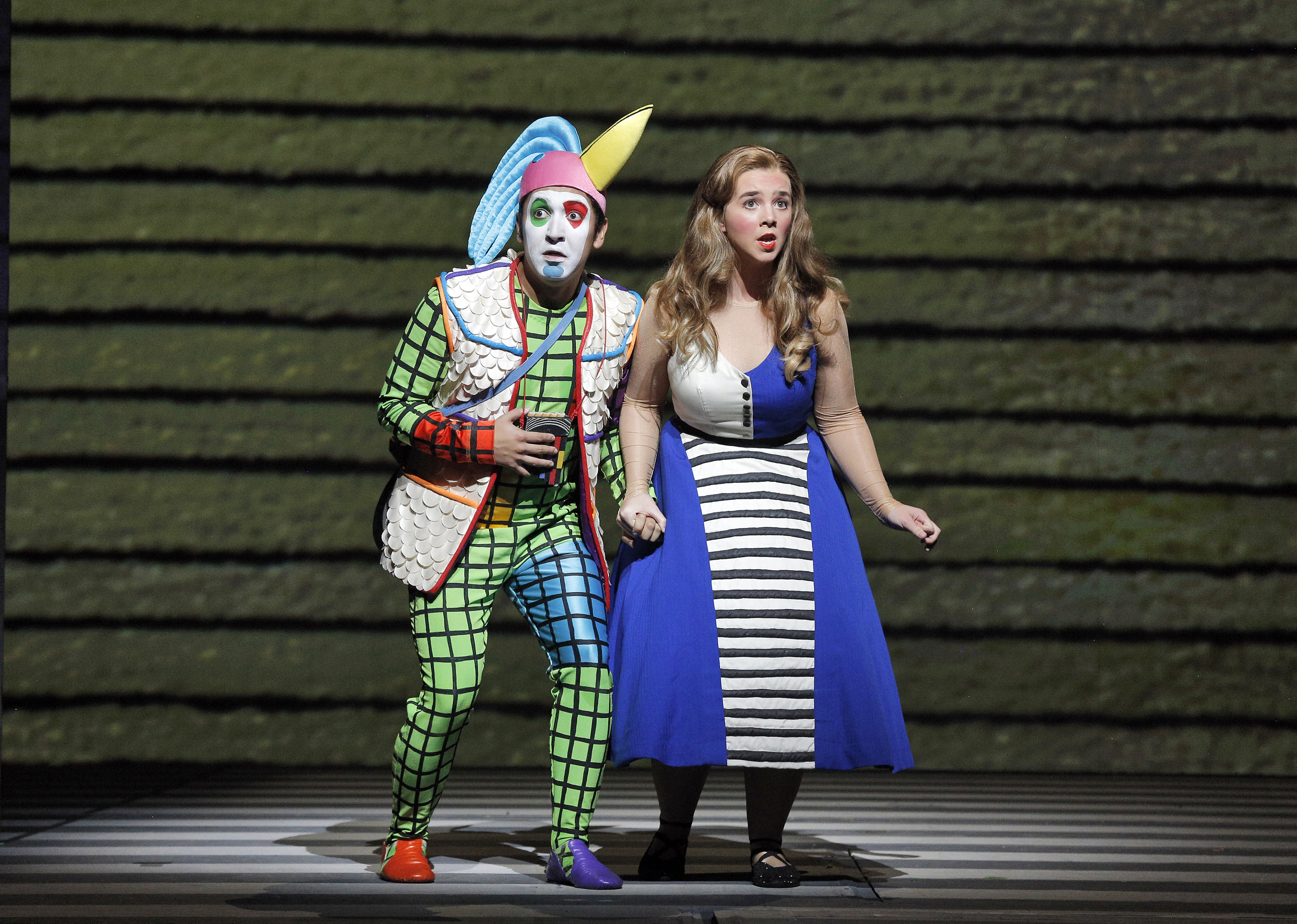 A revival of The Magic Flute opened at San Francisco Opera last night. The production has been beset with casting changes since August, and two more were announced from the War Memorial stage by General Director David Gockley before the performance. Adler Julie Adams sang First Lady for Jacqueline Piccolino and Kathryn Bowden filled in for Albina Shagimuratova, both replaced artists were apparently ailing. All four substitutions were more than adequate, in fact, Efraín Solís as Papageno and Sarah Shafer as Pamina (pictured above, photograph by Cory Weaver), standing in for former Adlers Philippe Sly and Nadine Sierra, may have stolen the show.