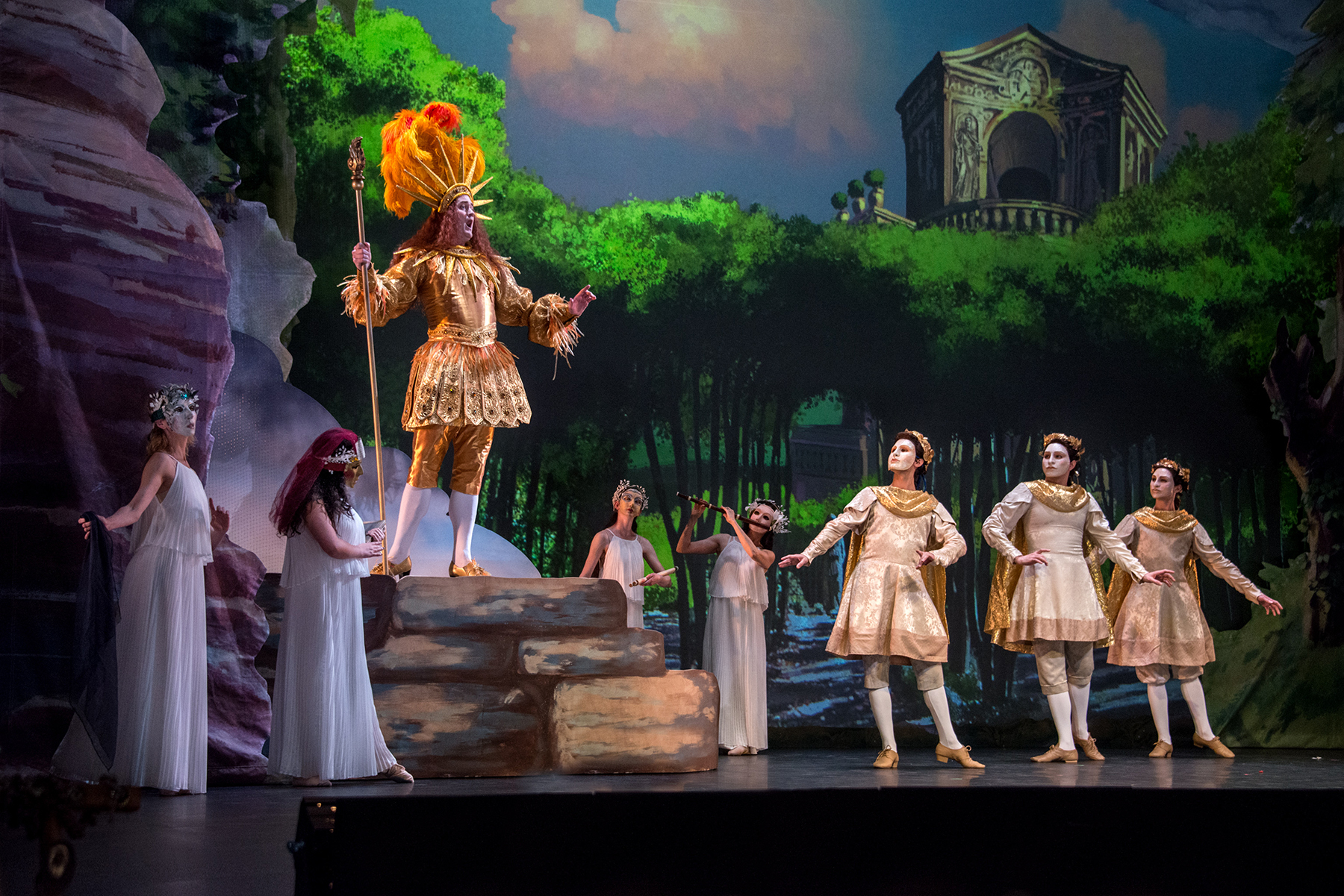 Nonetheless, there was a lot to look at, the costumes are eye-poppingly bright and feature lots of feathers. A dancer dressed as an ostrich in Act III was a hit. The set uses tasteful projections of painted scenes within a painted proscenium. I enjoyed very much that the UC Berkeley mascot, Ursus arctos californicus, was painted on the shield at the top.