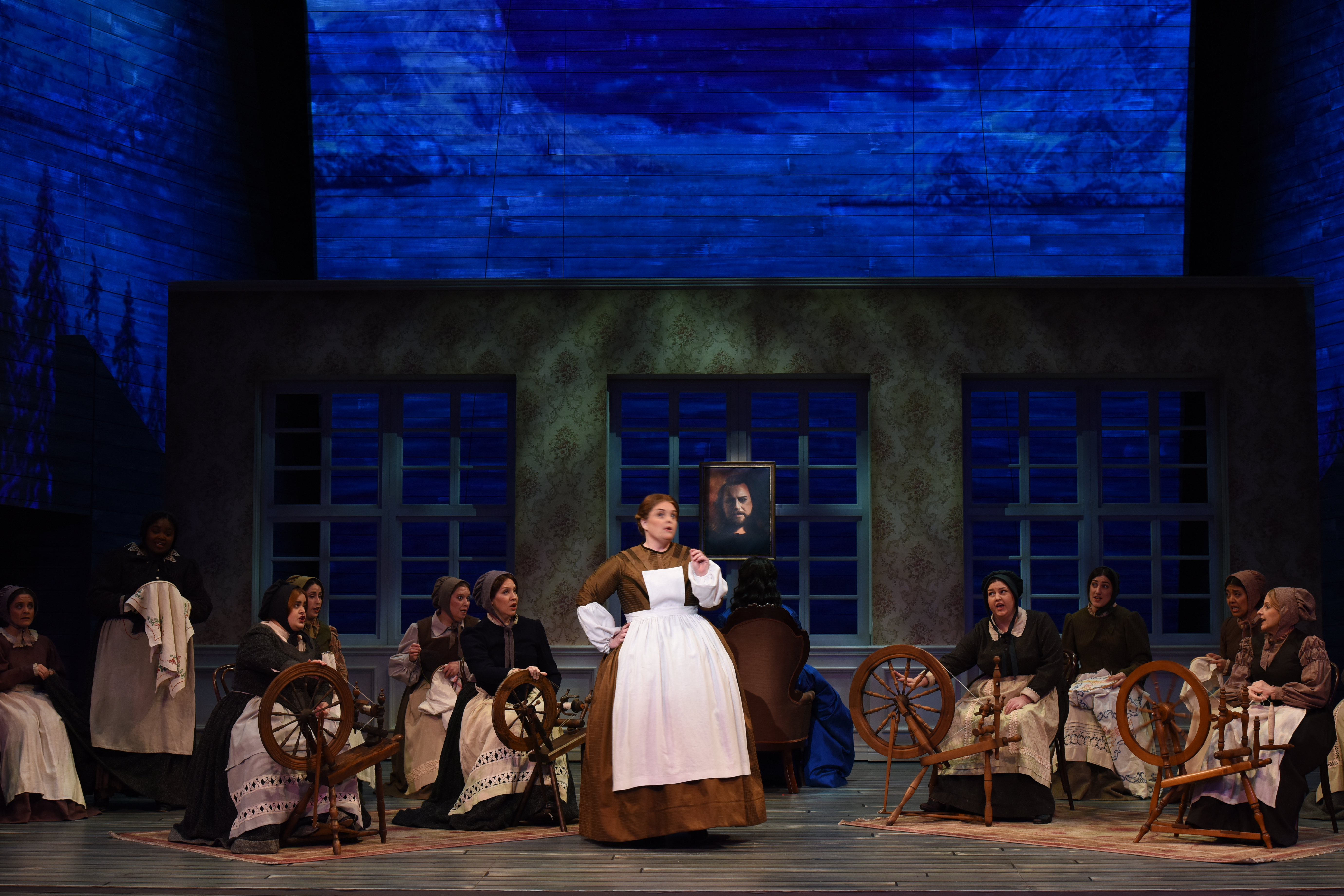 Brad Dalton’s direction is straightforward and unambiguous, he gets in the humor of both the Steersman and Daland, and he created dramatic tension in Act II by having Senta face upstage so long, with only her black curls and the folds of her deep blue gown visible. The last scene was perhaps the most abstract, it was also blinding, but it was unequivocal and effective.