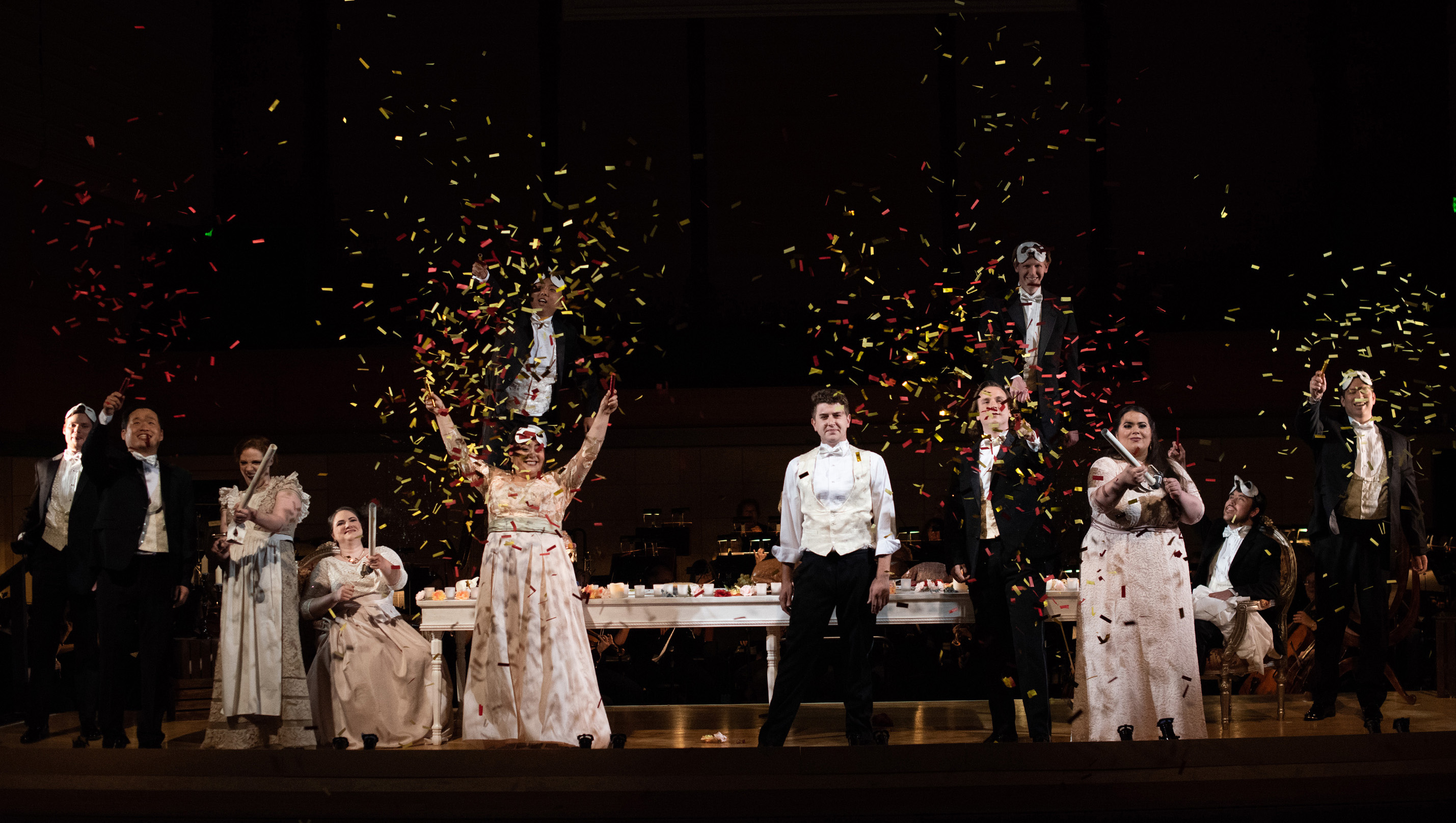 The evening started with the first scene of Vanessa and ended with the last one from Don Giovanni. The orchestra, conducted by Kathleen Kelly, was upstage behind the singers, and there were serious synchronization problems, especially by the end. All our young singers are quite loud and in the rather small space. They very gamely put on masks and got up on furniture as directed by Aria Umezawa and the blasts of confetti (pictured, photograph by Kristen Loken) at the end were wonderful fun.