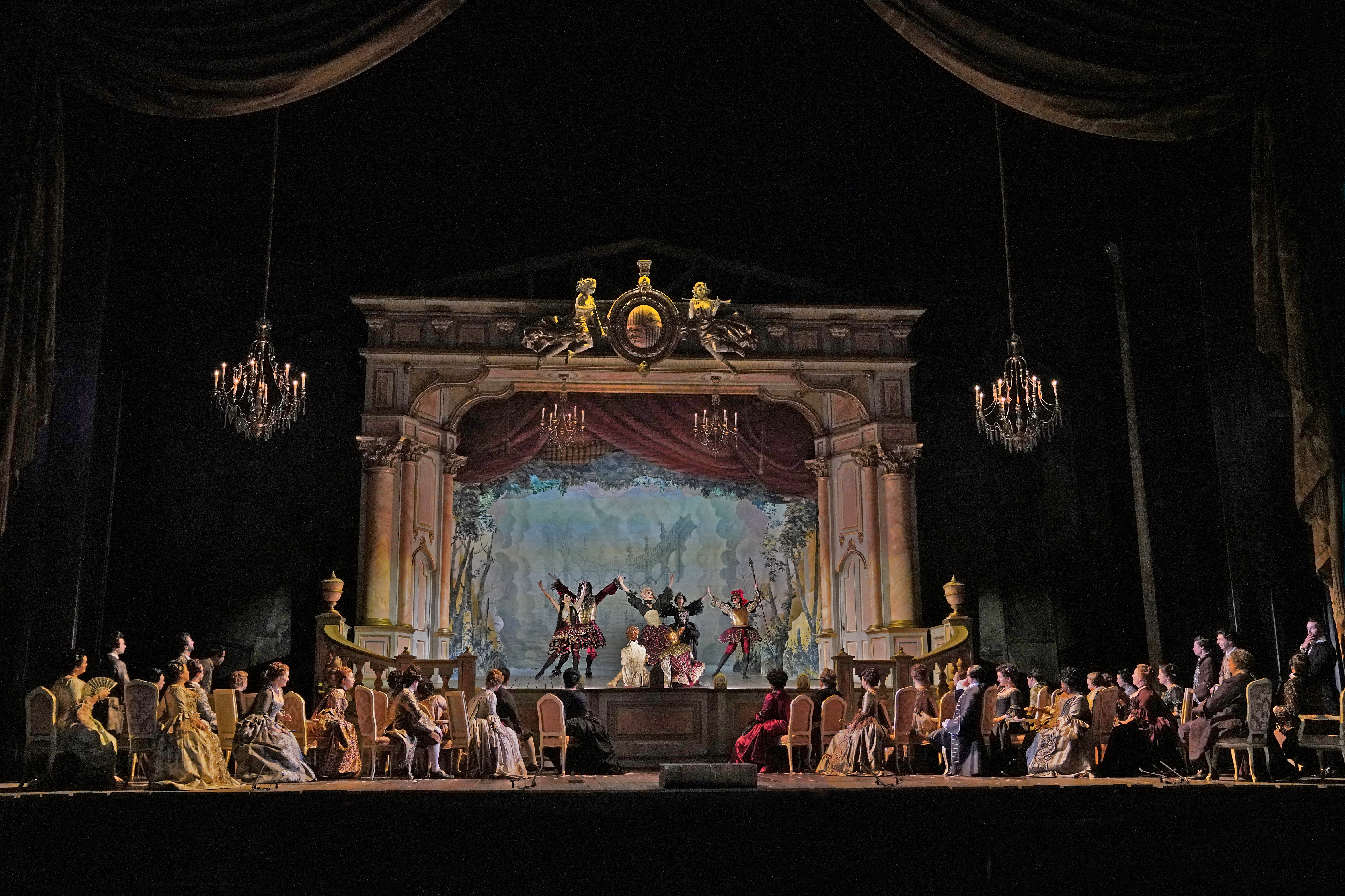 The new David McVicar production is very droll, everything looks nice and Rococo, as the piece is set in 1730. There is one long pause between Acts I and II, but McVicar puts in a sight-gag to draw the audience back in before the music starts up again.