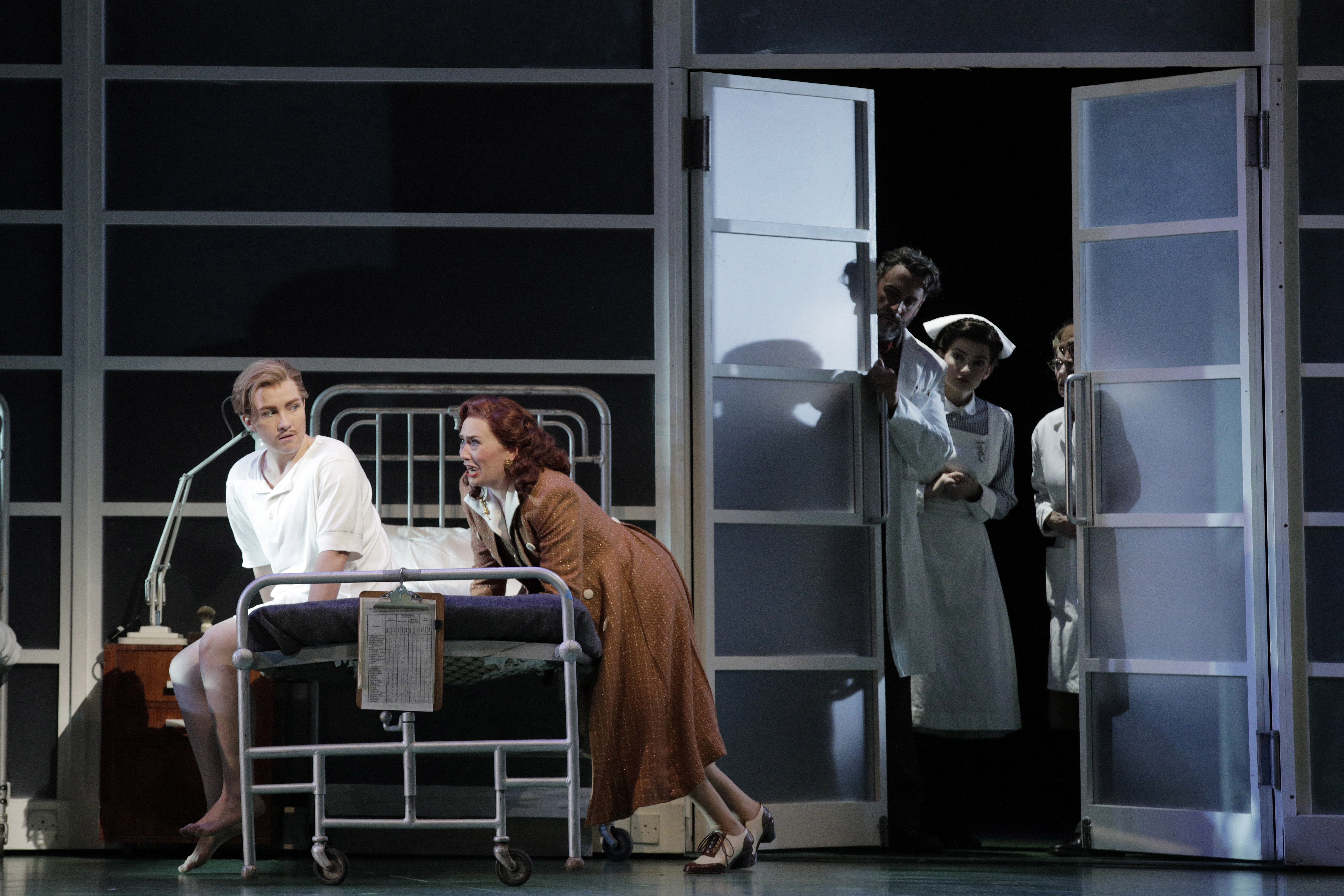 The set is based on a real hospital from 1933, and has green floors and basically three different configurations. Mostly they simply turn the stage around. The scenes move quickly but don't have much visual impact, people aimlessly wander through. There are projections, but all are rather literal. We see a diamond ring and Angelica's eyes many times. For the most part it was tame, but I was outright annoyed by the bombing that took place at the end of Act II during Orlando's music. It didn't add anything to the drama and only got in the way of experiencing the opera.
