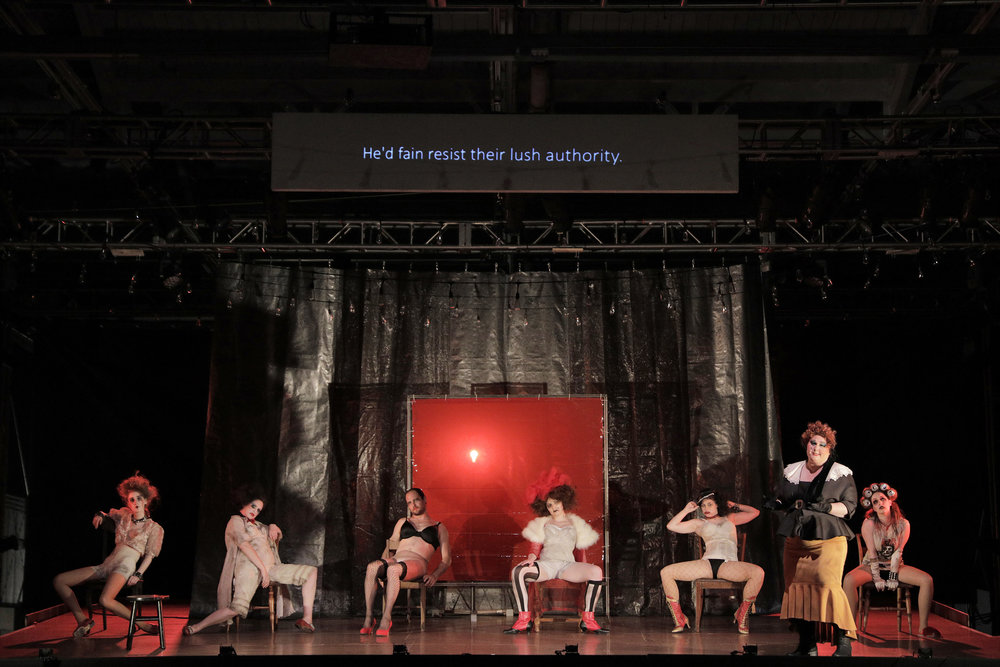 The staging is very much in keeping with what director Elkhannah Pulitzer has presented at West Edge before. There's lots of curtains used to hide the stage when scenes are being switched out, lots of attractive tableaux, and plenty of people in various states of undress. I am not sure the circus artists were used to the best effect, any acrobatics that appeared were pretty subtle. But the finale was quite fun and involved a tricycle rather than a horse and a confetti gun.