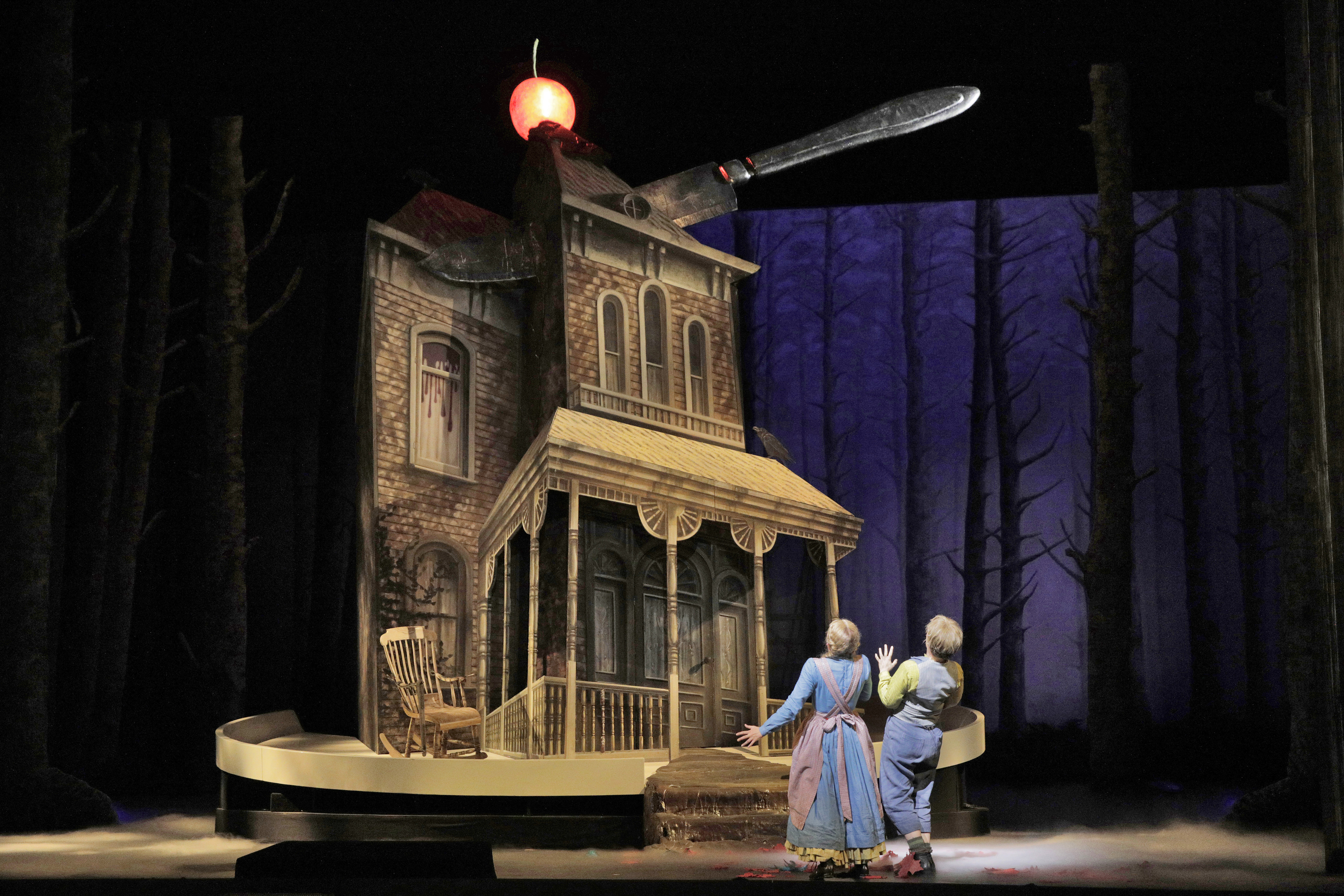 This creepy set is inspired by Alfred Hitchcock, and this works surprisingly well — the darkness of the original folk tale comes through. All the set changes are smooth, there were only a few awkward loud sounds against the floor in the forest scene of Act II.