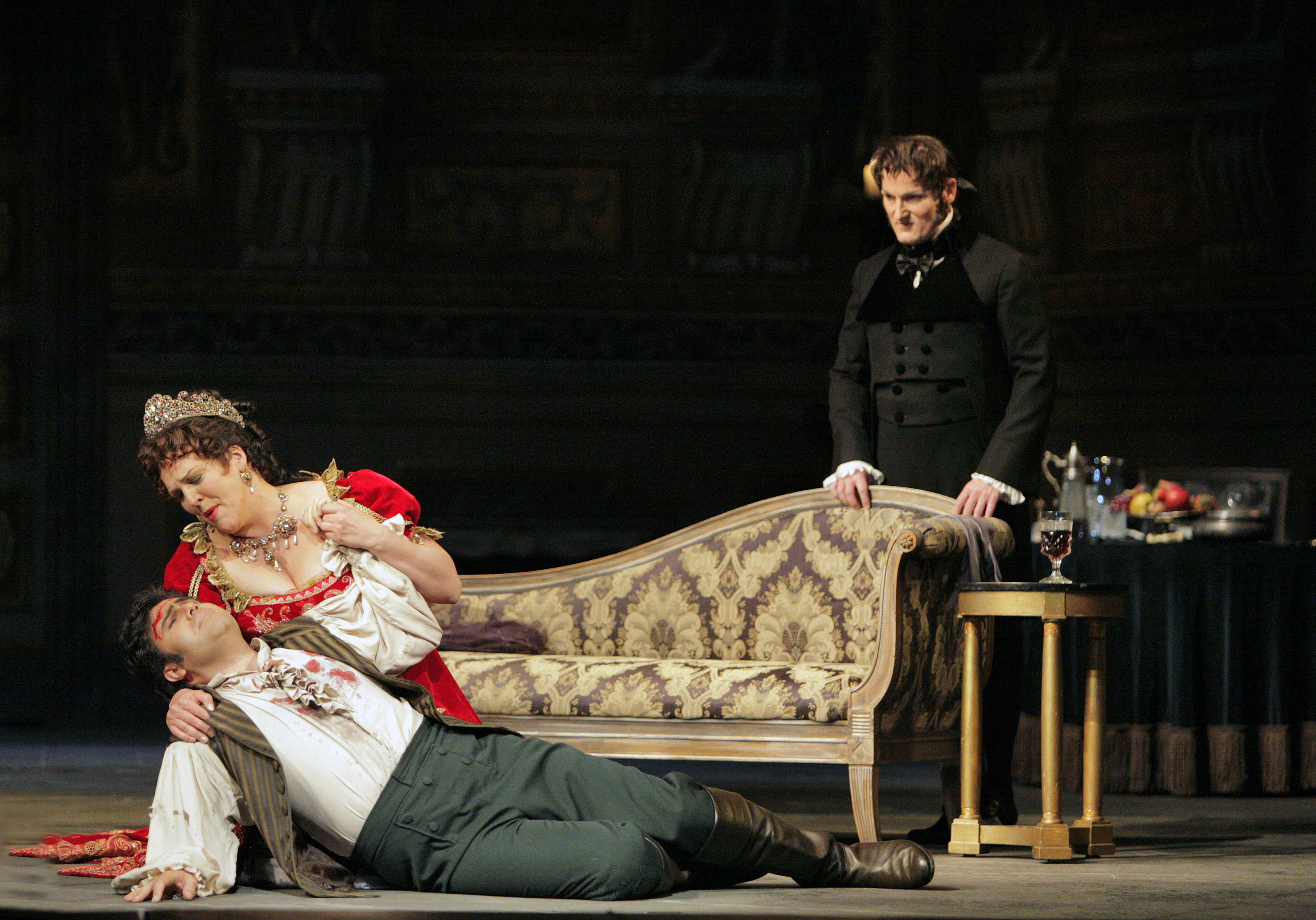 San Francisco Opera has rescheduled Puccini's Tosca on February 12 and 13 at the Fort Mason Flix Drive-In. The 2009 production starring Adrianne Pieczonka (pictured with Carlo Ventri as Cavaradossi and Joel Sorensen as Spoletta, photograph by Cory Weaver) in the title role was orignally set for December 11 and 12 but was cancelled because of the Stay at Home order that ended on Monday.