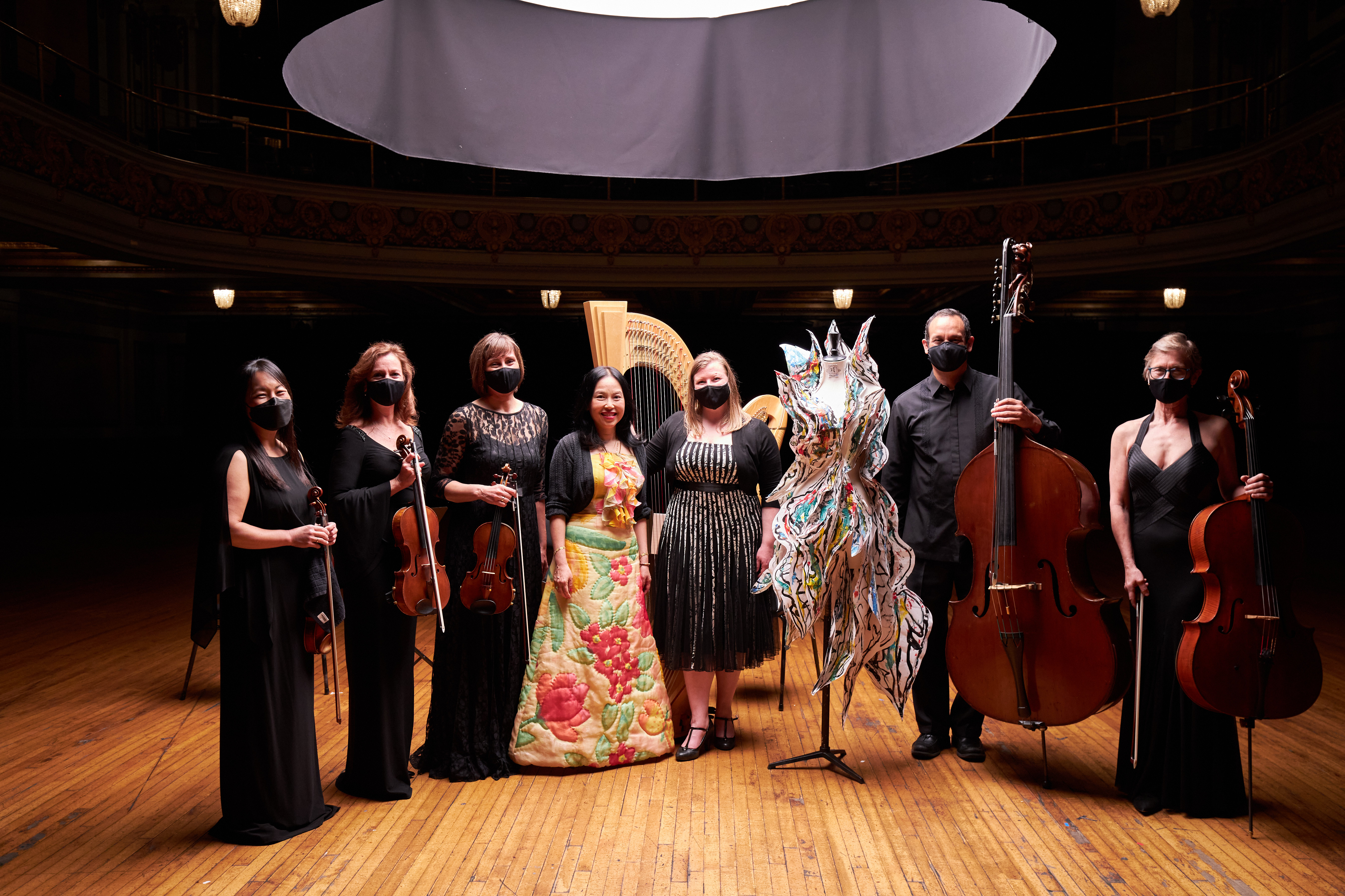 Quen created a mixed media sculpture inspired by a performance of Debussy’s Danse sacrée et Danse profane for harp and strings. Meredith Clark is the harp soloist and the ensemble includes violinists Iris Stone and Karen Shinozaki Sor; violist Elizabeth Prior; cellist Michelle Djokic; and bassist Anthony Manzo.
