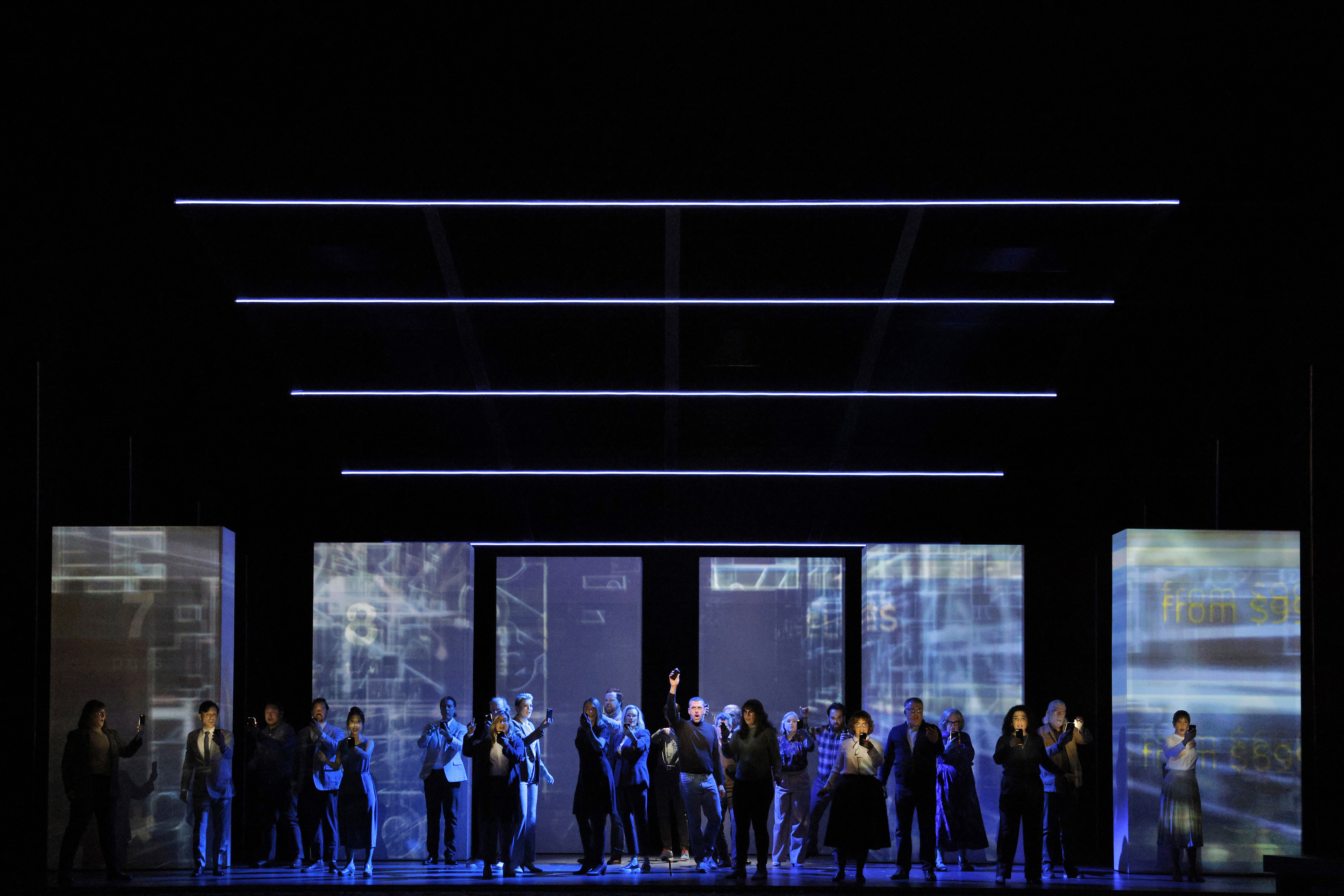 The set, by Vita Tzykun, flows easily from scene to scene as it is mostly segments of walls that can have projections on them plus props that are rolled on and off or picked by singers or stagehands. Kevin Newbury's direction is straightforward. There were times when the projections were slightly tiresome, like the moving motherboard ones (pictured, photograph by Cory Weaver), which reminded me of The PeopleMover Thru The World Of Tron ride at Disneyland back in the 1980s and 90s.