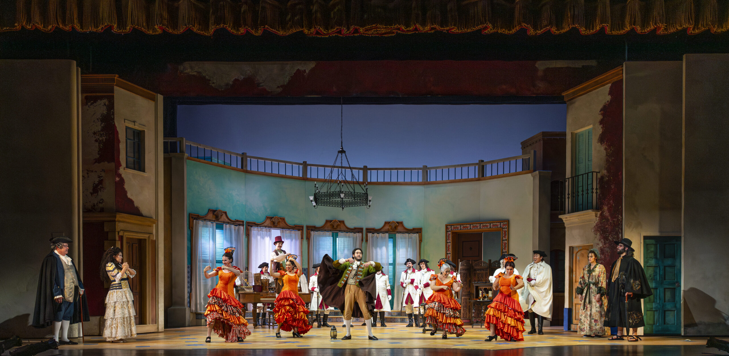It was unclear if we were on the ground floor (pictured, photograph by David Allen) or if we were a level up, as there was a door downstage that was supposedly to the outside but there was also a balcony on that same level upstage. But I did like the liveliness of the production, the walls that didn’t behave and stay put, the four flamenco dancers that would dramatically appear for really no reason except that the action takes place in Seville. The storm scene had a dream sequence in it, which was novel and effective.