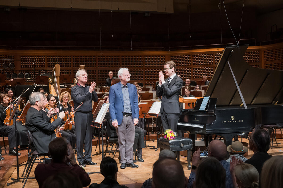 San Francisco Symphony gave the world premiere of John Adams’ piano concerto After the Fall (2024) with Víkingur Ólafsson as the soloist last Thursday with two following performances this weekend. The orchestra was very much together with Maestro David Robertson (pictured on the left with Adams in the center and Ólafsson on the right, photograph by Brandon Patoc) at the helm during the performance I attended last night.