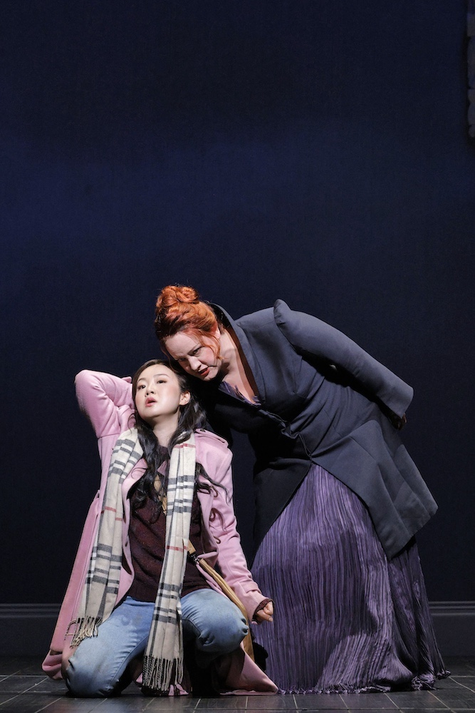 The 2023 production comes from Opera Australia and is directed by Lindy Hume. Set in contemporary times, the scenery features three walls enclosing a revolving platform and projections of the Tasmanian coast and forest. The opening scene shows seagulls flying around, and the videos switch up the scenes with ease without getting in the way of the music. Anna Cordingley's costumes favor black, very sleek and elegant, but Ilia has a pink trench coat to start and Elettra wears a dramatic purple gown that is offset by an elaborate gold headpiece and collar in Act II.