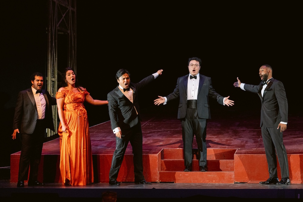 The ensembles were strong, especially “Don Basilio!… Cosa veggo! Buona sera, mio signore” from Il barbiere di Siviglia (pictured, photograph by Kristen Loken). Baritone Joeavian Rivera has a nice, light tone for Figaro, mezzo-soprano Ariana Maubach likewise sounded very pretty as Rosina. Tenor Minghao Liu was completely charming as Almaviva and bass-baritone Justice Yates was a fine Bartolo. Bass-baritone Wanchun Liang was humorous as Basilio. The motivation of money was featured prominently, and Basilio comes back for a dropped pouch, which makes his return make more sense.