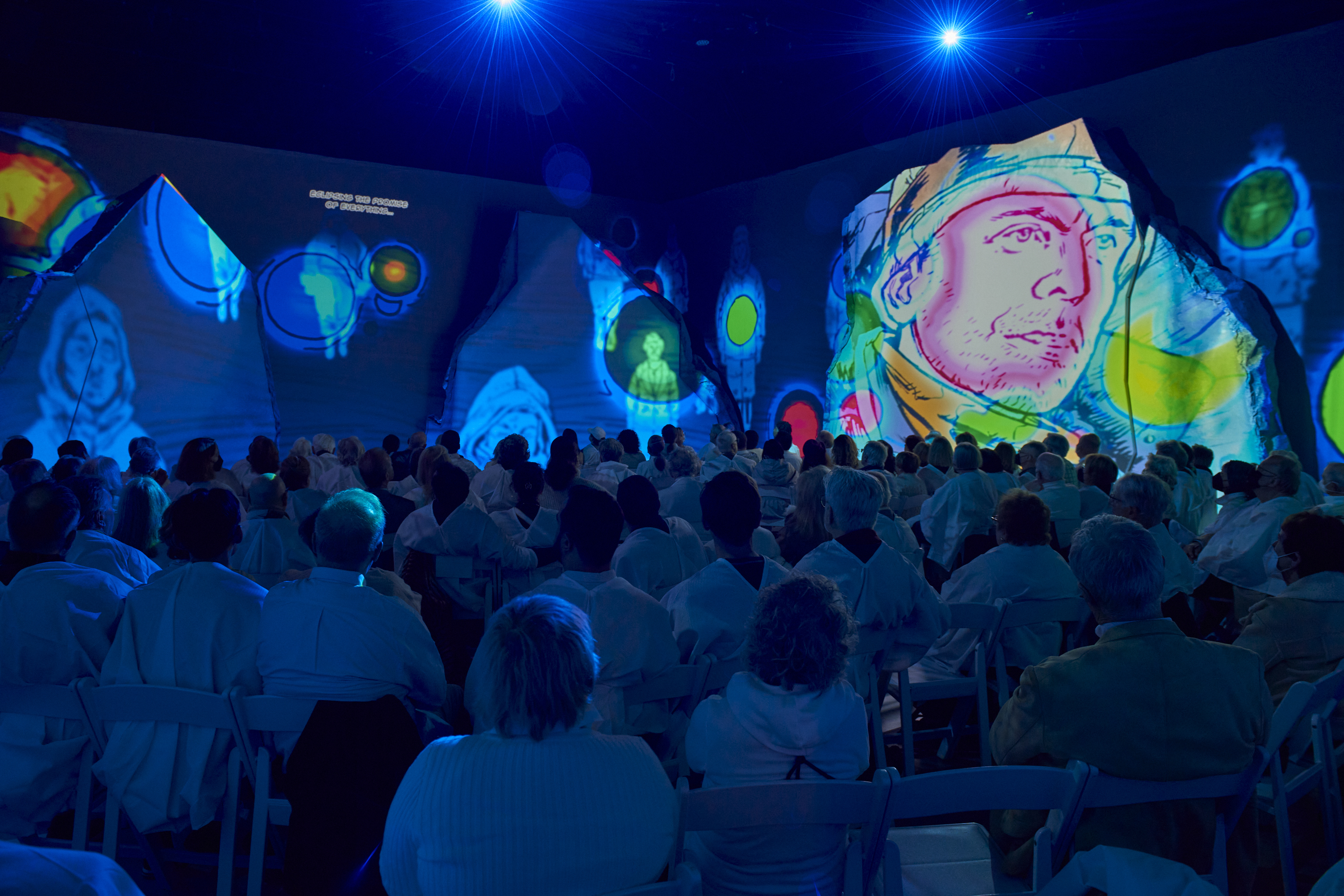 The set, designed by Jacquelyn Scott, is on all sides, made up of 9 projectors on various surfaces, some flat and some that look more like mountains. The audience was asked to either wear white or cover up with white ponchos, I very much enjoy a directive like this and kept thinking to myself that "I am snow!" The graphic novel aesthetic provided by illustrator Mark Simmons is pleasing, even the supertitles are done in lettering that looks like it is from a comic strip. The production makes use of motion capture to animate the faces of the singers, and this works well, though occasionally things do feel a little creepy. Sometimes the eyes are too unwavering, the lack of blinking unnerving somehow. The Projection Designer and Director of Photography David Murakami did a good job making sure everything was as seamless as possible.