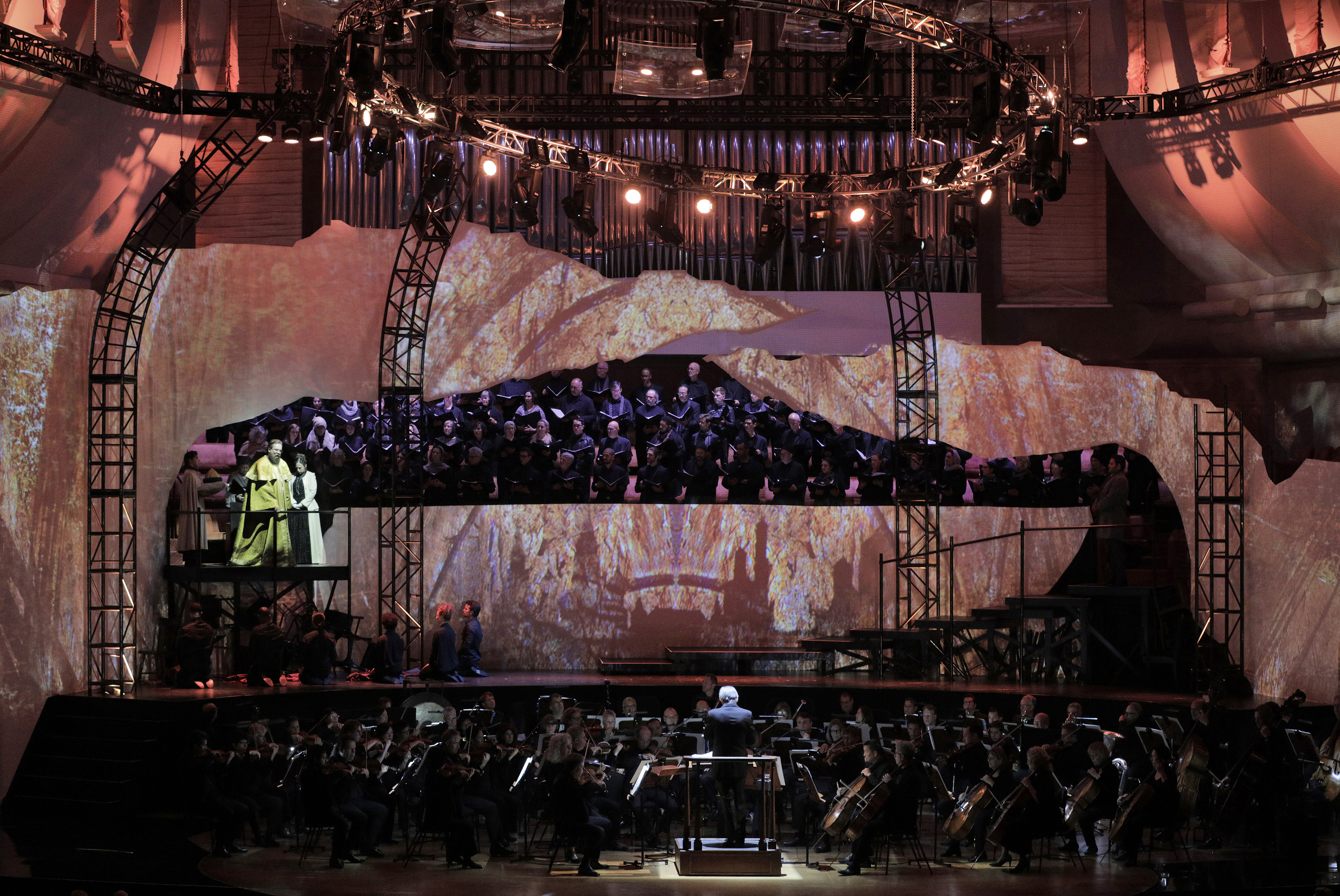 The music seems difficult, Francesconi studied with Karlheinz Stockhausen and Luciano Berio, and the piece requires electronics, a live orchestra, and a pre-recorded one with a chorus. There was a lot of shimmers, buzzes, and elaborate percussion. I spent a lot of time looking at the supertitles, as it could be quite hard to understand the words, which come from the play but translated into English and expounded on by the composer. The musicians, lead by Maestro John Kennedy, looked like they were concentrating intensely, and as far as I could tell everything came off the way it was supposed to. Soprano Heather Buck and baritone Hadleigh Adams both sounded and looked great. Buck's voice could be angelic or dangerous, while Adams has a pleasant, lyrical tone.