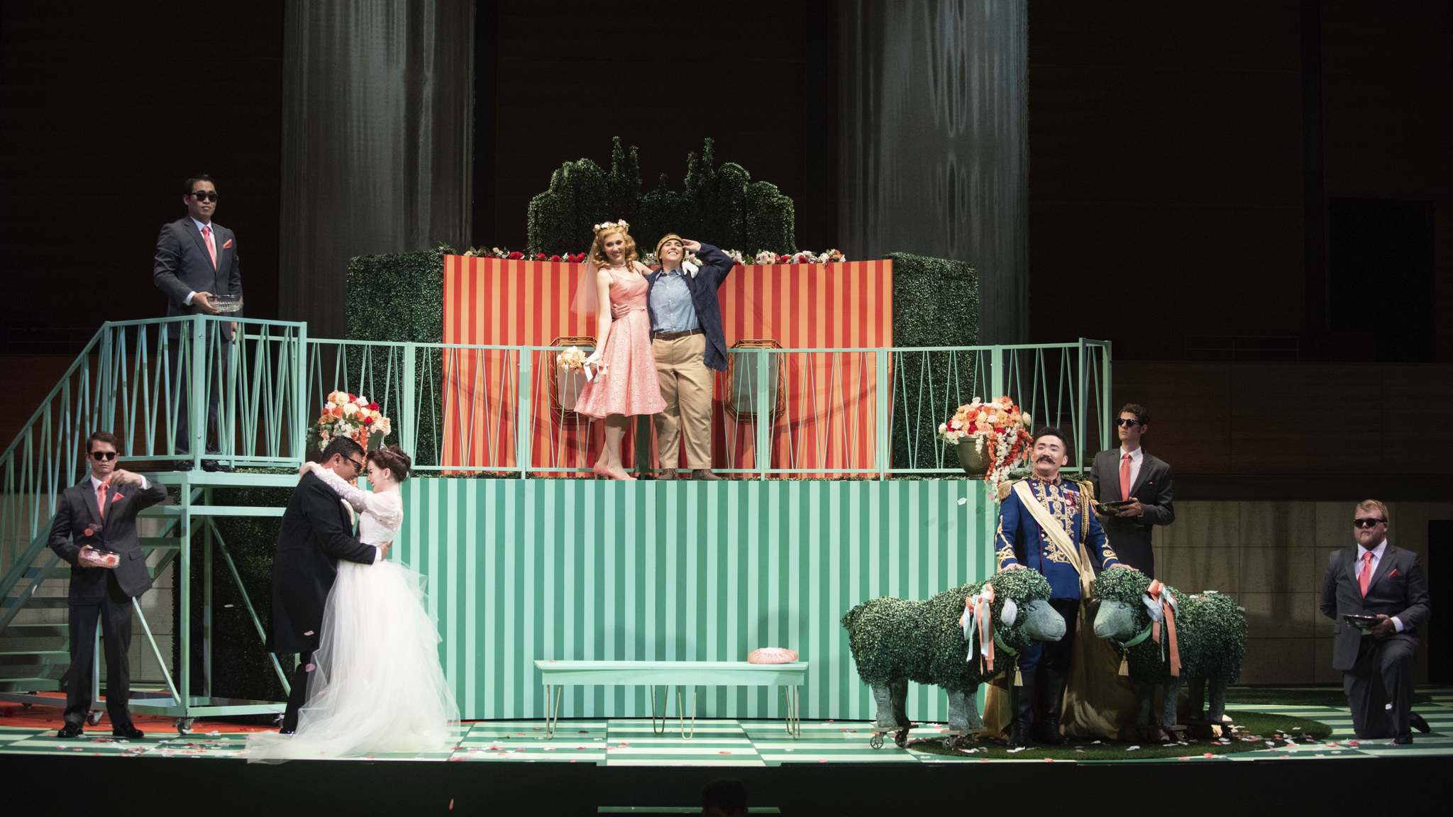 Director Elkhanah Pulitzer keeps everything clear by use of onstage costume changes, even though there are many scenes in this one act opera, and the English text can get lost in the layers of music. Chad Owens' set is unique: there are two dressing rooms on the left and right above two showers, the dressing rooms can be assessed by either ladders or a steeply raked platform. In the center is a long dining table for eight and around the orchestra runs a strip of stage as well.